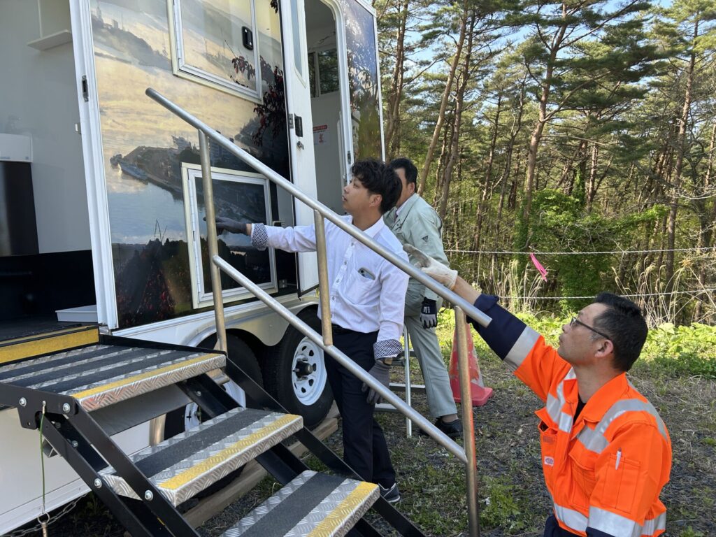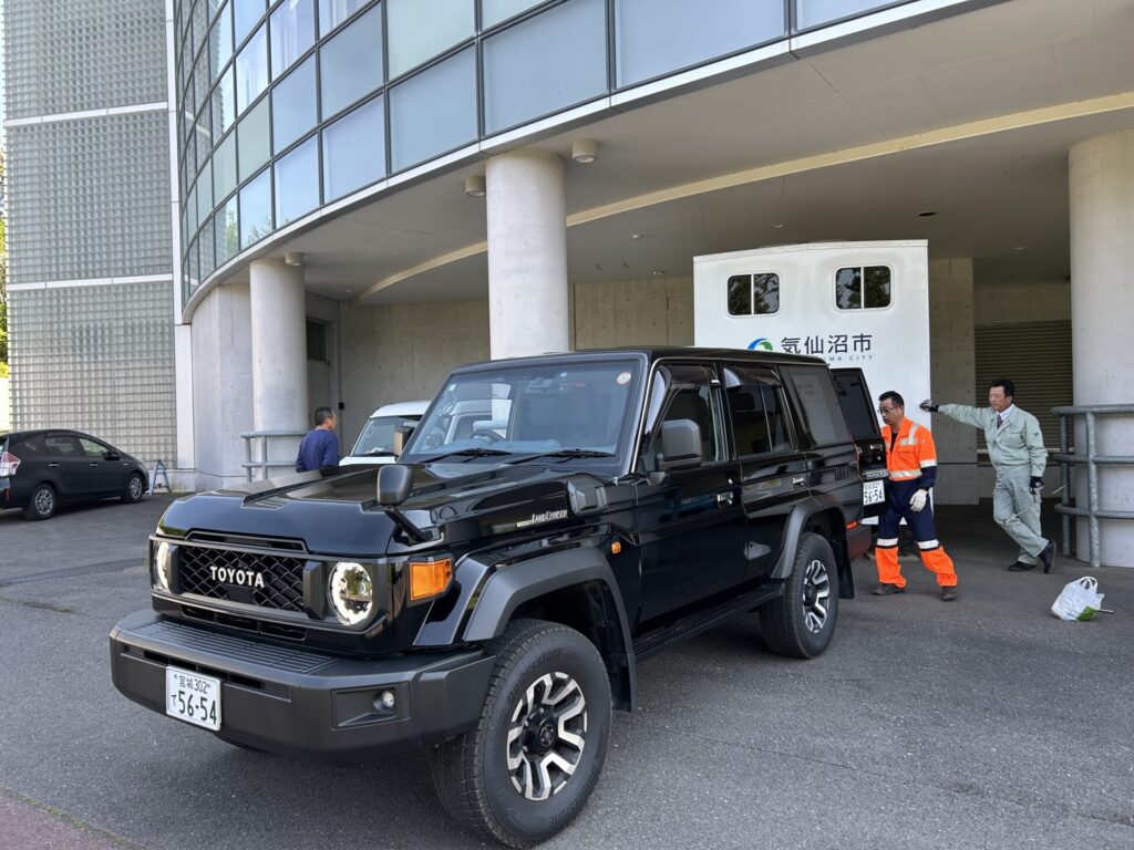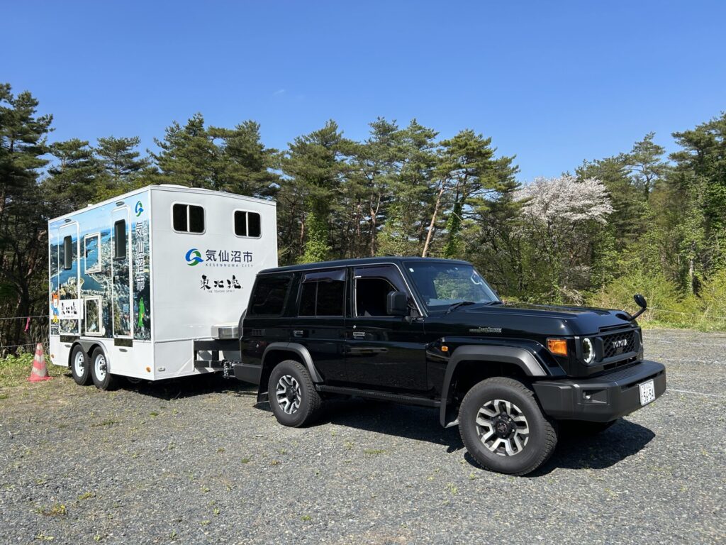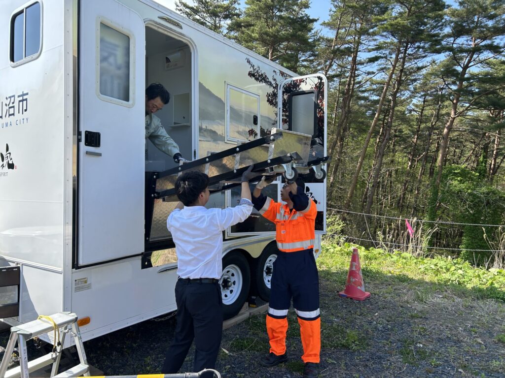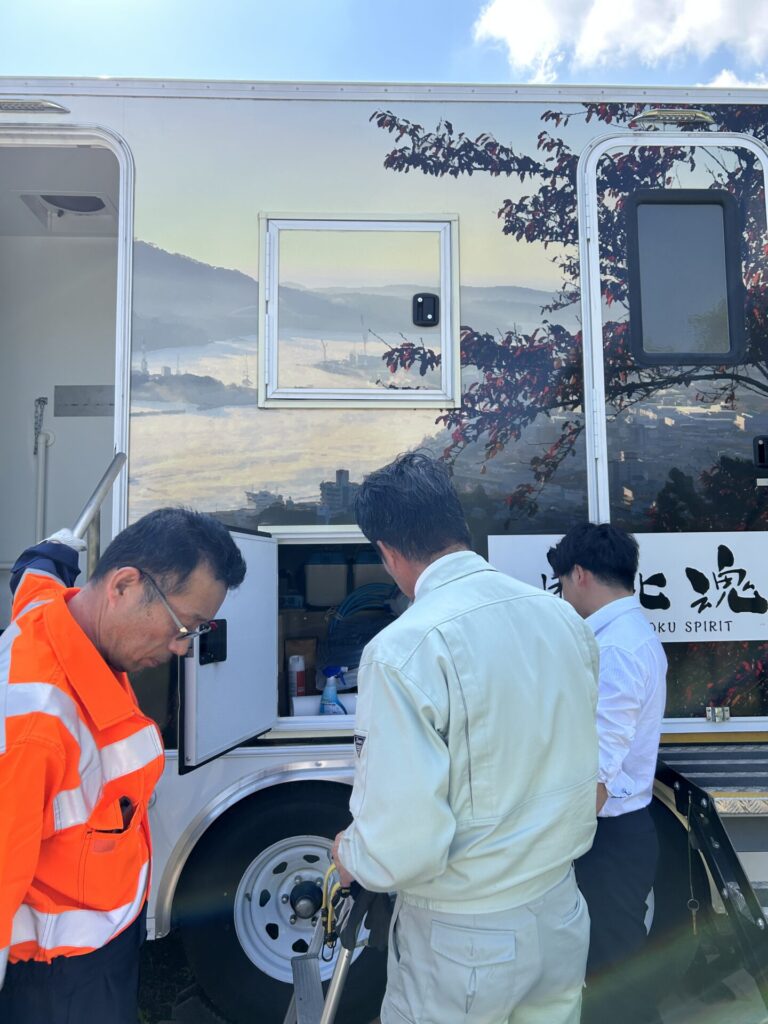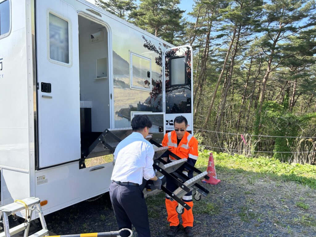気仙沼市役所の方と、我らが誇る専務がタッグを組んで、トイレトレーラーをバシッとセットアップしていきます!
